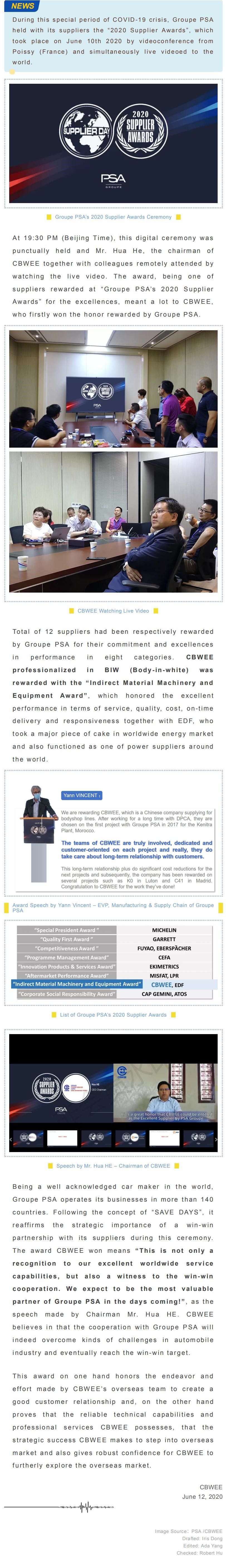 CBWEE Rewarded with “Groupe PSA’s 2020 Supplier Awards”